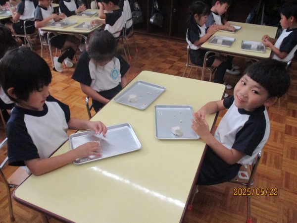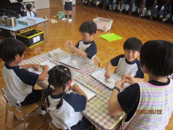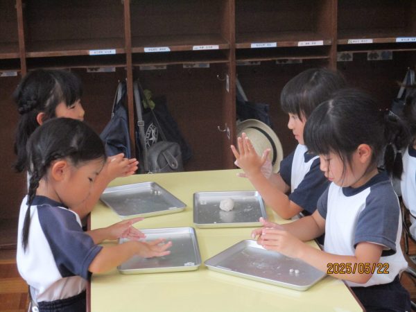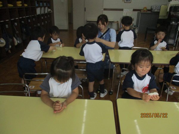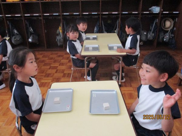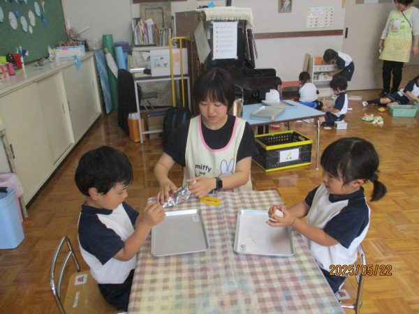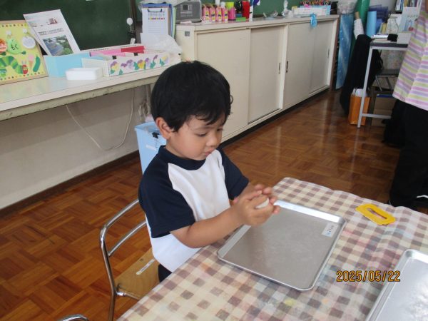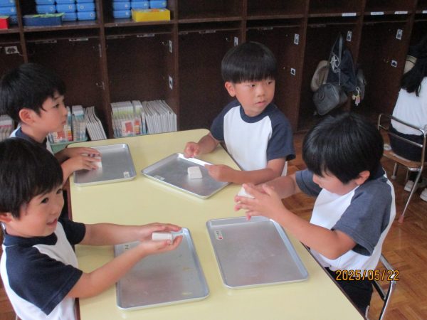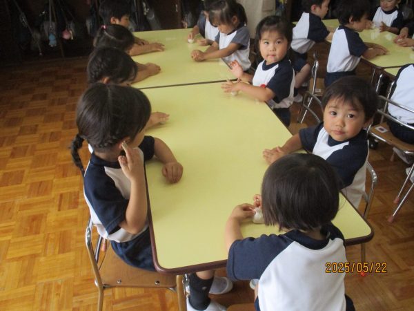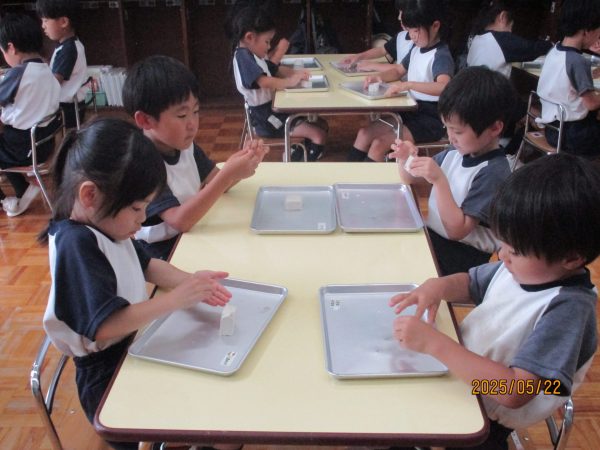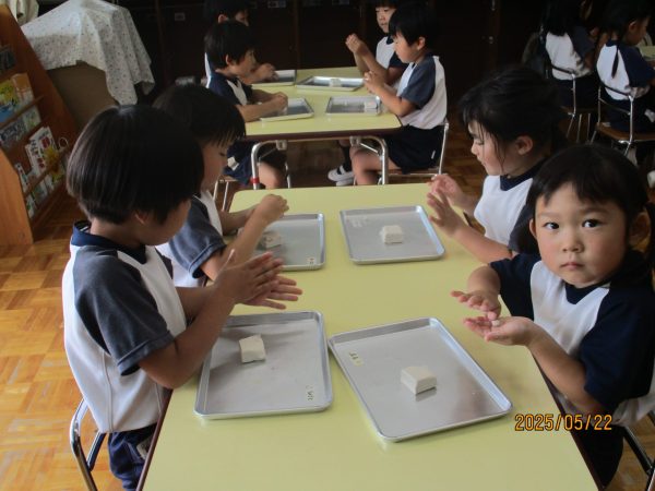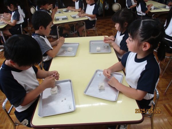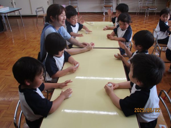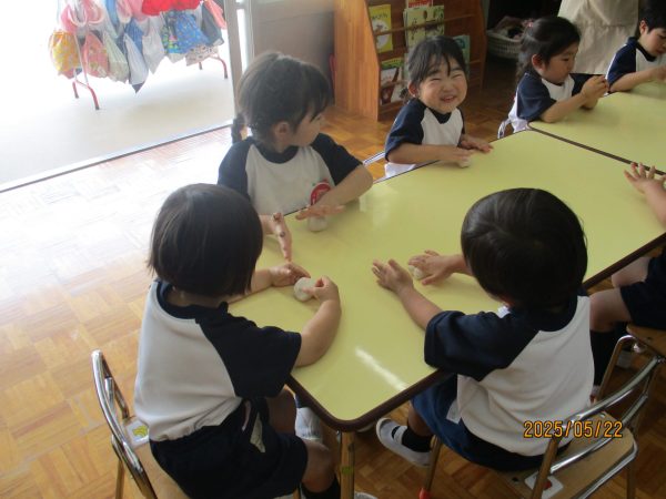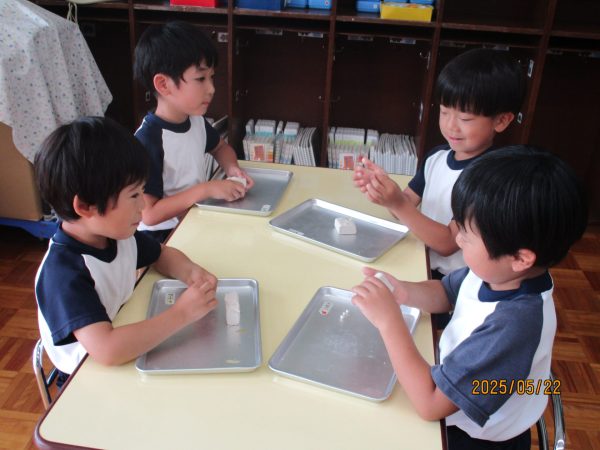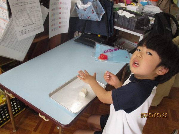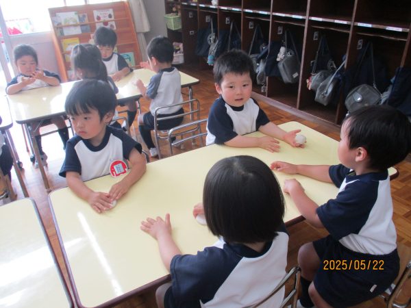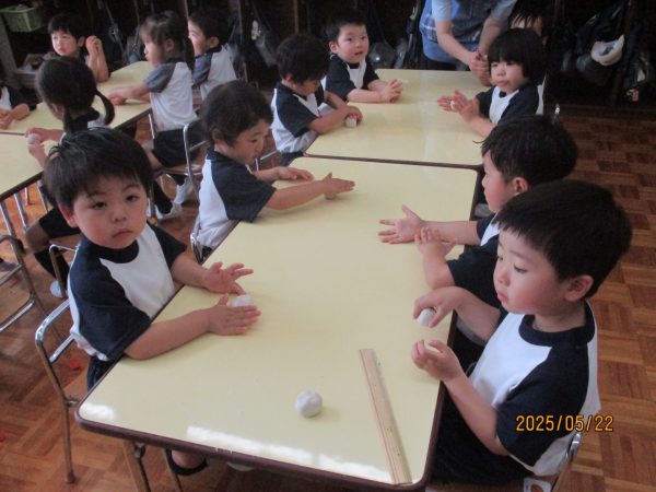 ねんどをしました。 何ができるのでしょうね。 <年長> 子ども達の前には、四角いおとうふのようなねんどがありますね。 目でしょうか? ちいさい丸い玉を二個、作りました。 <年中> 年中さんは交代で行いました。 ねんどをしていない子ども達は自由遊びを楽しみました。 <年少> 四角いねんどを平らに、まぁ~るくしました。