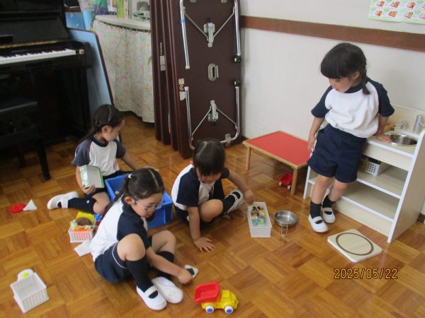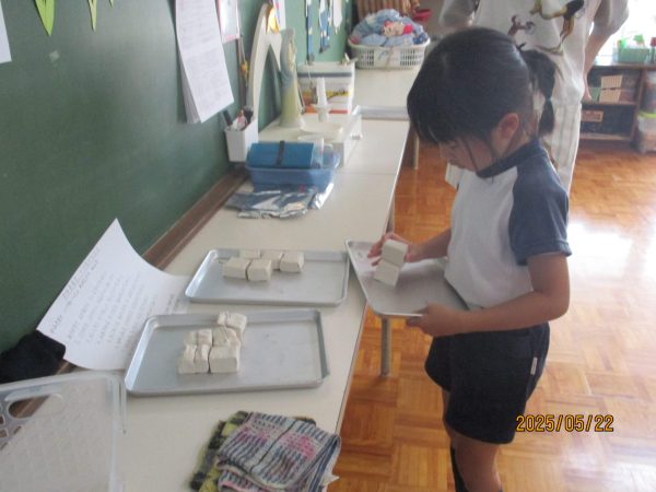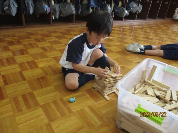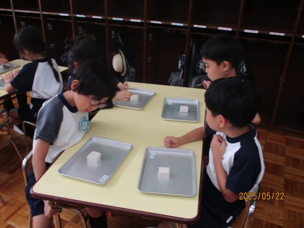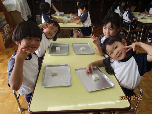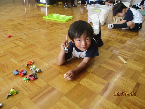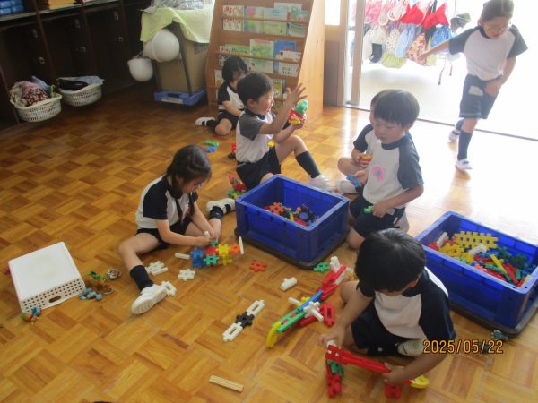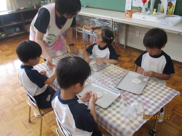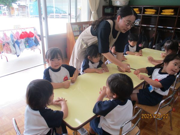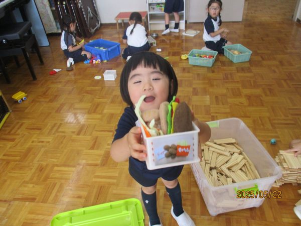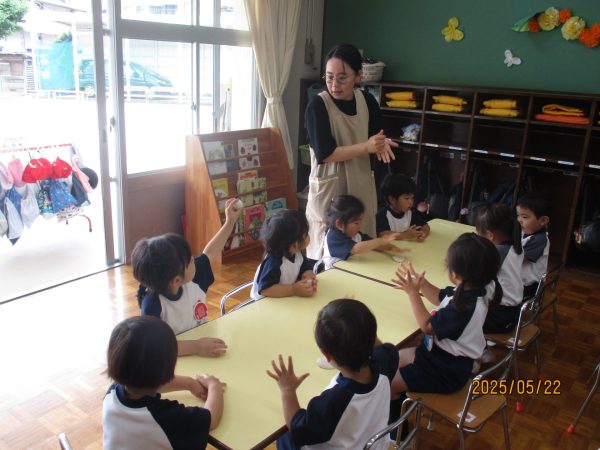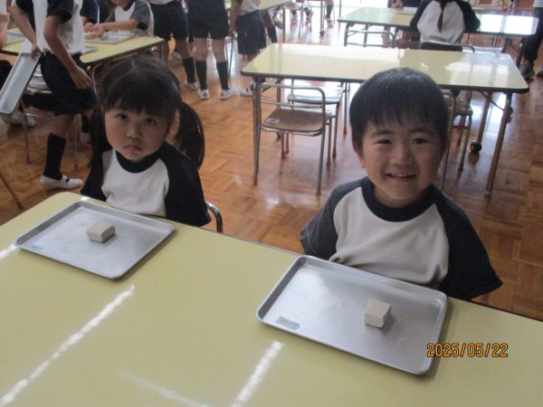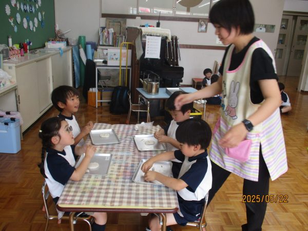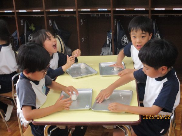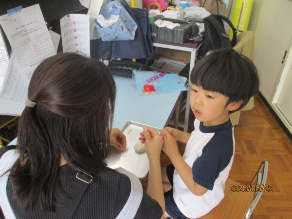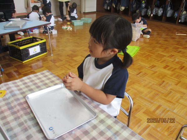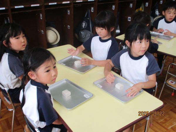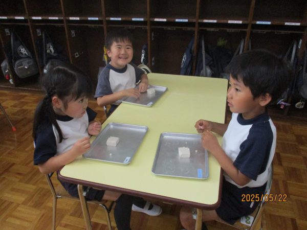 ねんどをしました。 何ができるのでしょうね。 <年長> 子ども達の前には、四角いおとうふのようなねんどがありますね。 目でしょうか? ちいさい丸い玉を二個、作りました。 <年中> 年中さんは交代で行いました。 ねんどをしていない子ども達は自由遊びを楽しみました。 <年少> 四角いねんどを平らに、まぁ~るくしました。