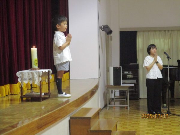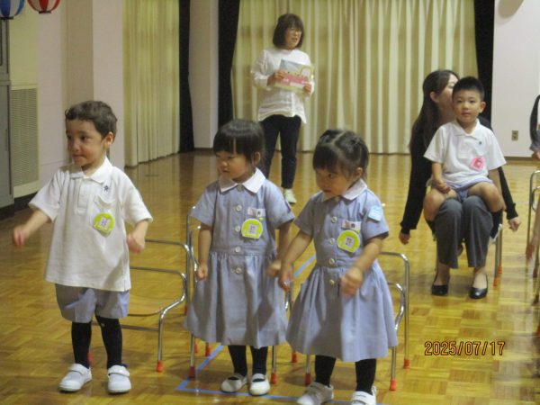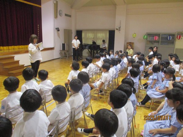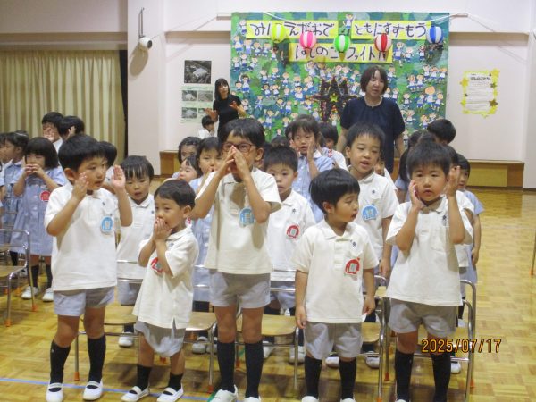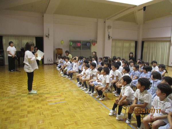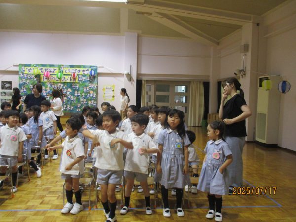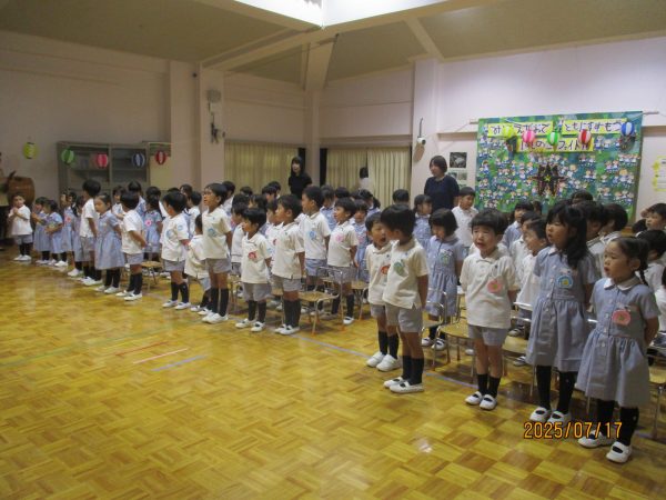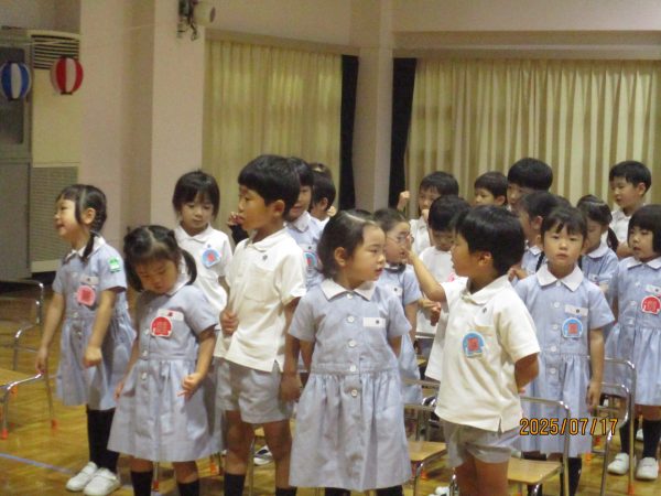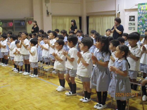 最後に、夏休みに向けて元気よく大きな声で♪やっほっほーなつやすみ♪を歌い、続いて、晃華学園暁星幼稚園園歌を歌いました。