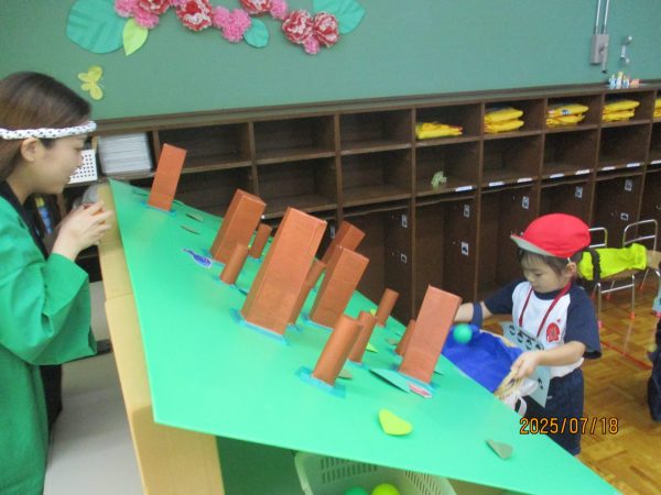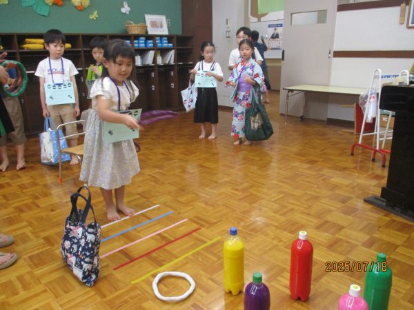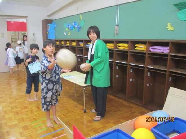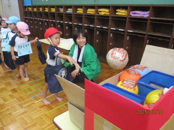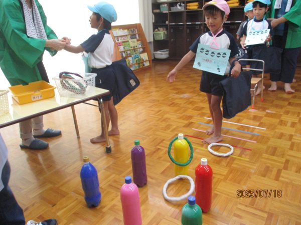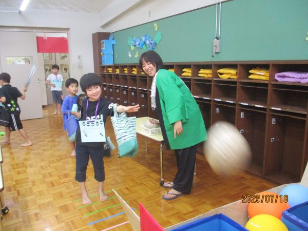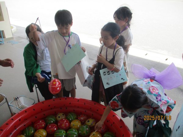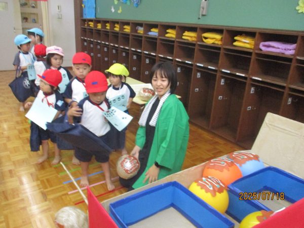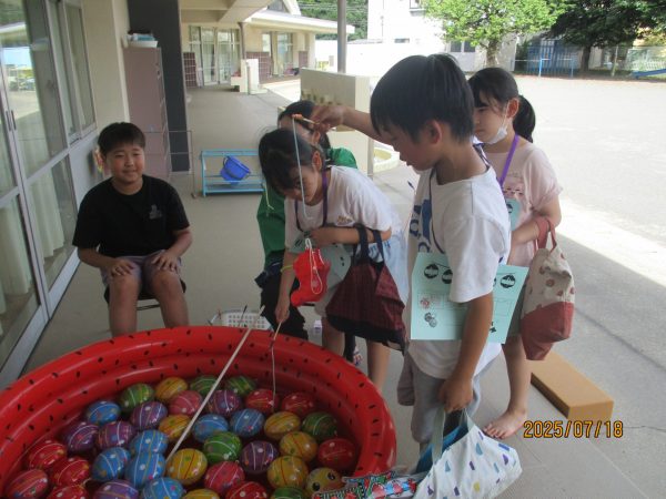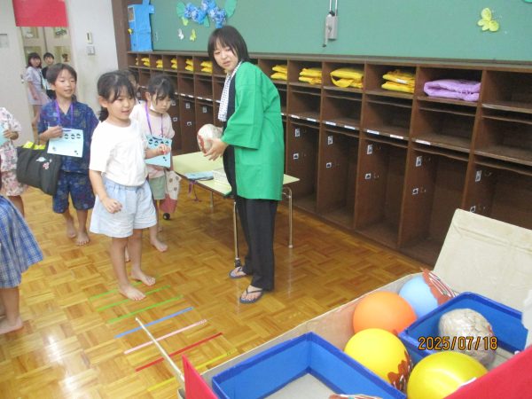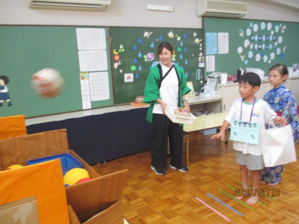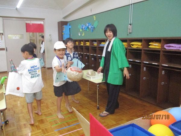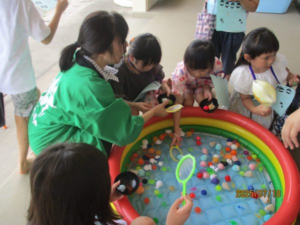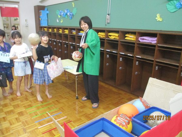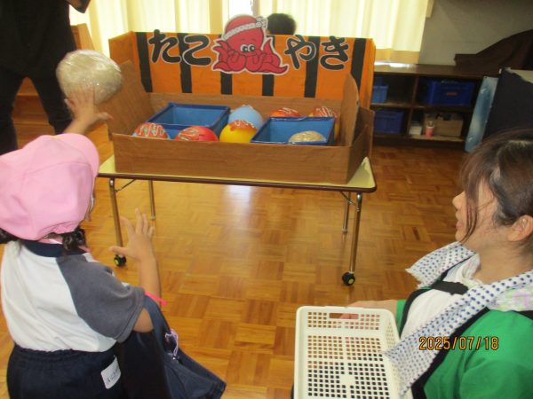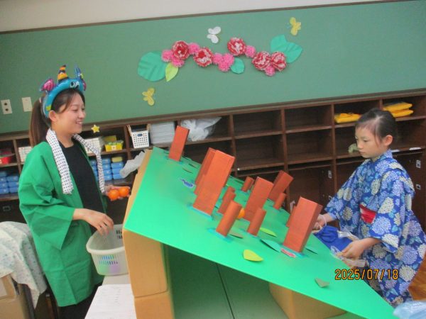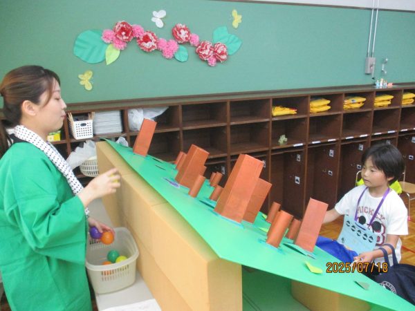 子ども達はくだものキャッチ、たこやき、わなげ、すくいもの、ドリングバーの各コーナーで、夏まつりを楽しみました。