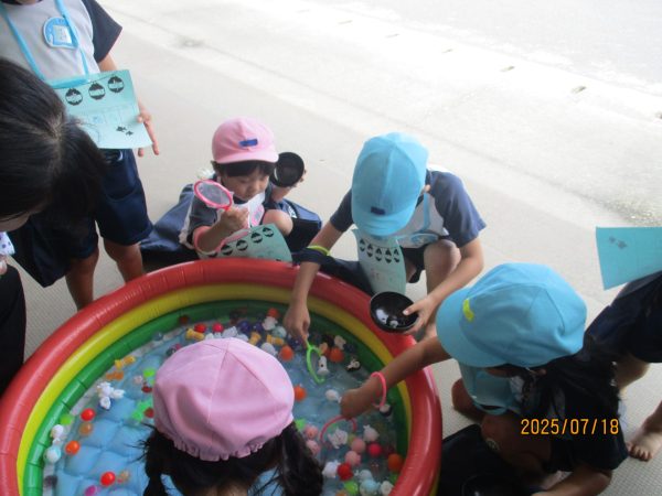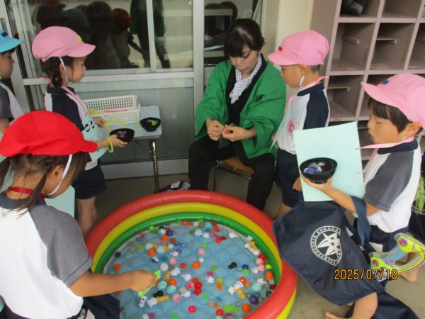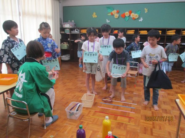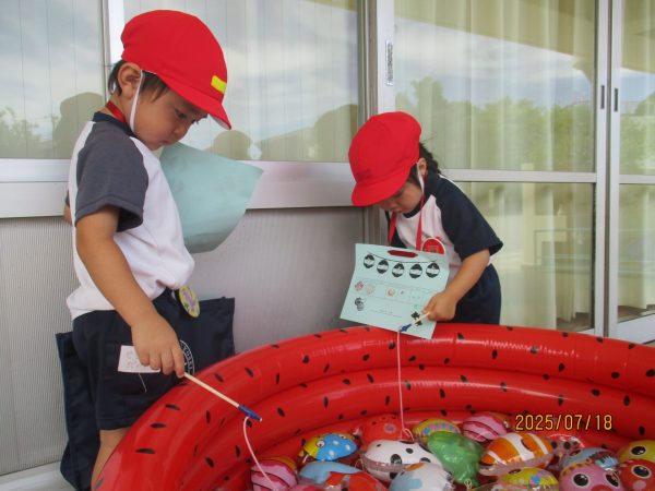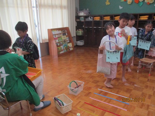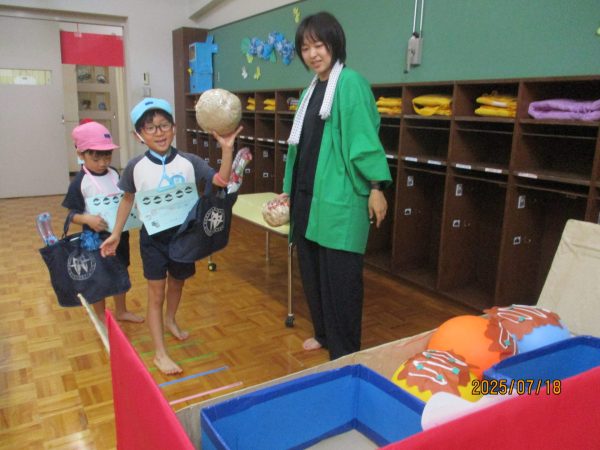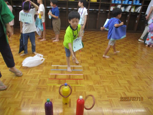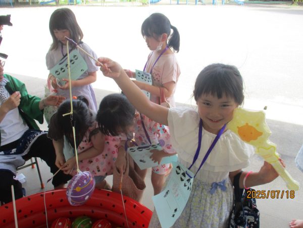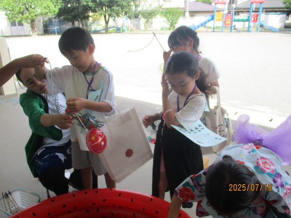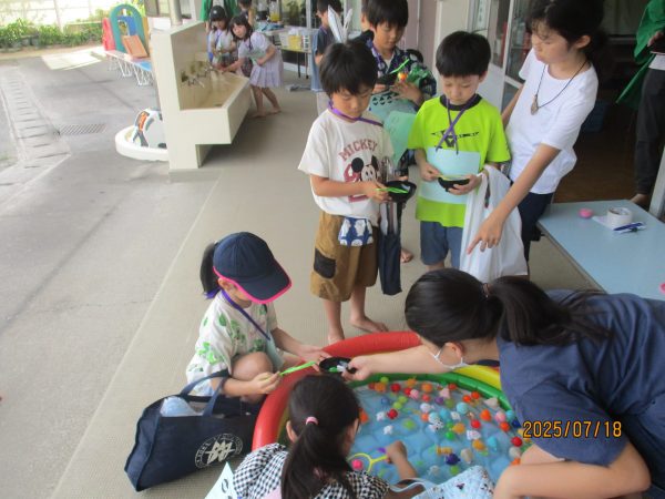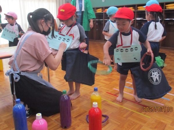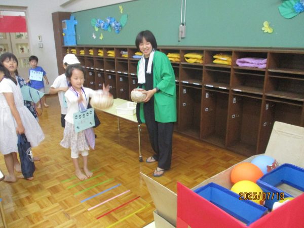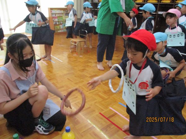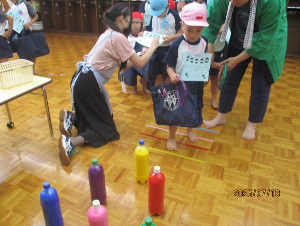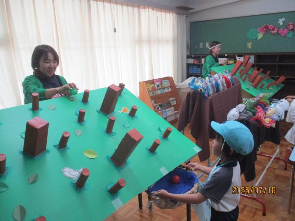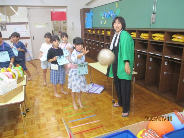 子ども達はくだものキャッチ、たこやき、わなげ、すくいもの、ドリングバーの各コーナーで、夏まつりを楽しみました。