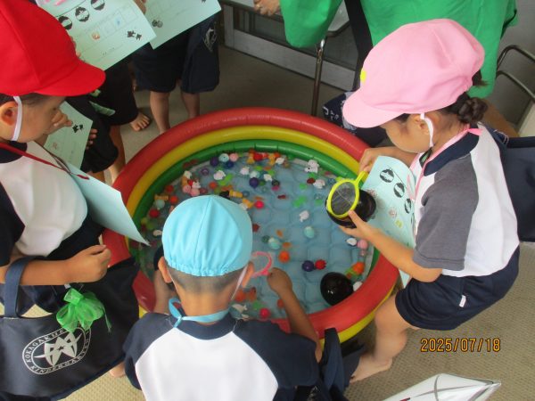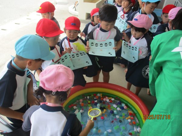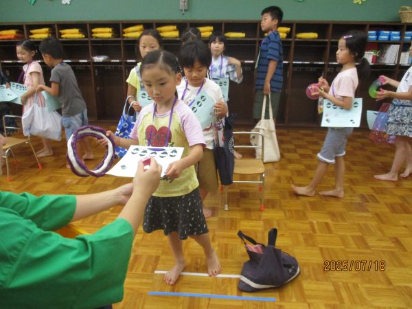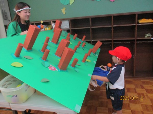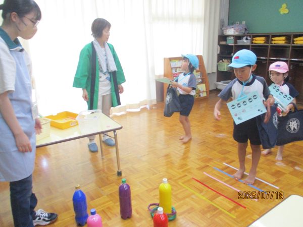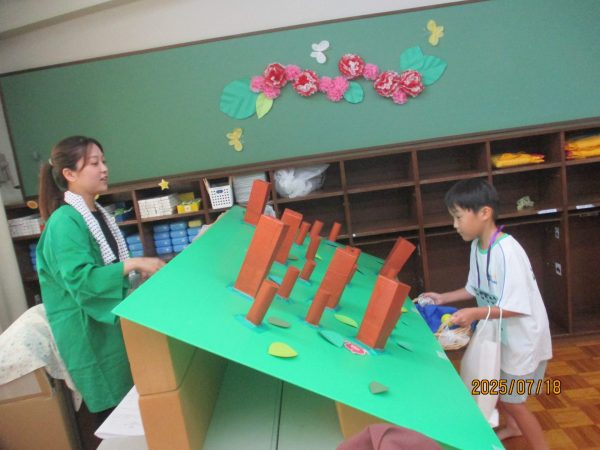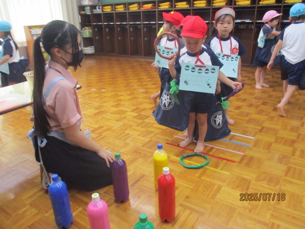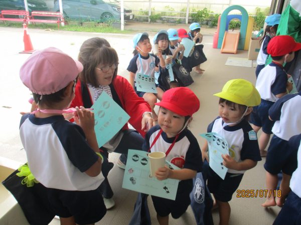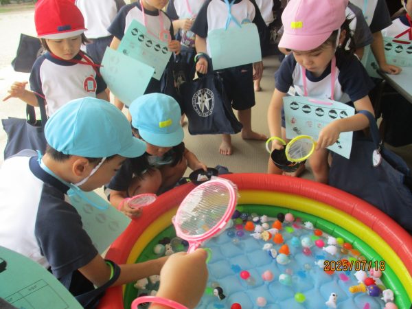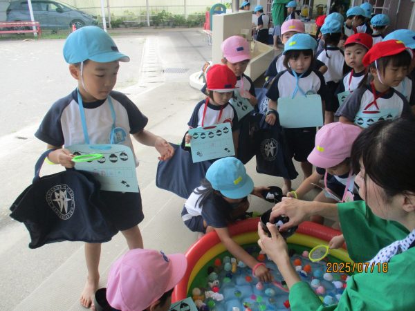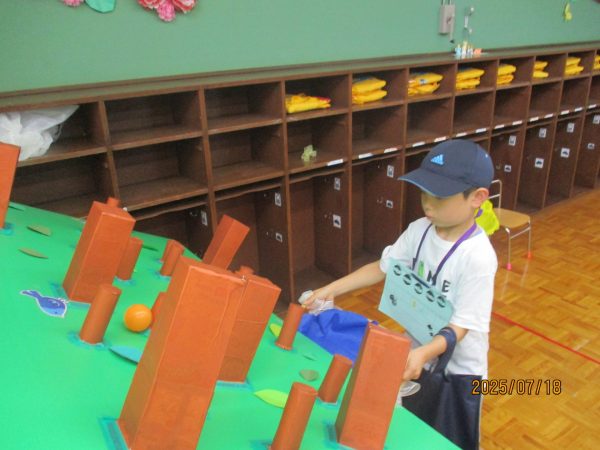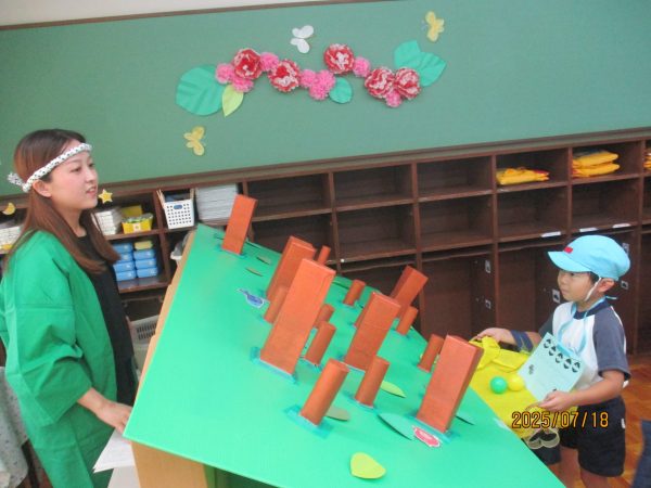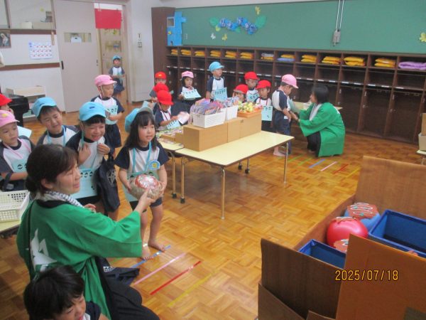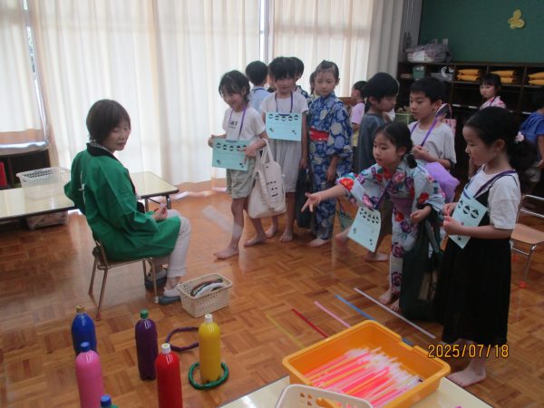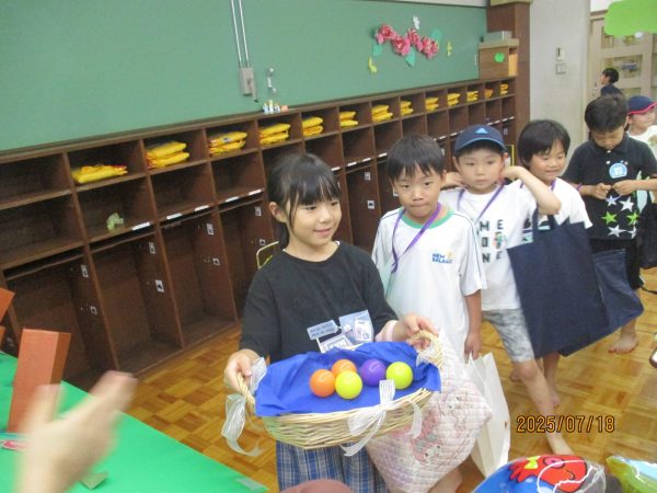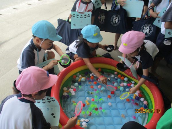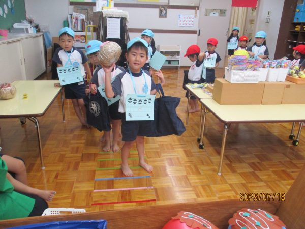 子ども達はくだものキャッチ、たこやき、わなげ、すくいもの、ドリングバーの各コーナーで、夏まつりを楽しみました。