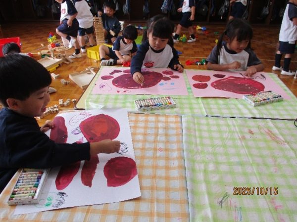 年少組は、お芋の絵を描くグループと自由遊びを楽しむグループに分かれて活動しました。