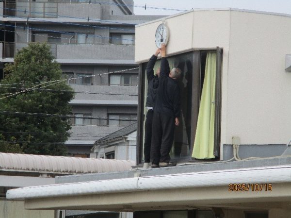 園庭からよく見える時計が新しくなりました。運転士さんが、取り付けてくださいました。