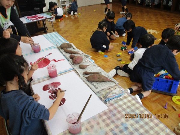 年中組は、何人かに分かれて行っている「お芋の観察画」を今日も行いました。