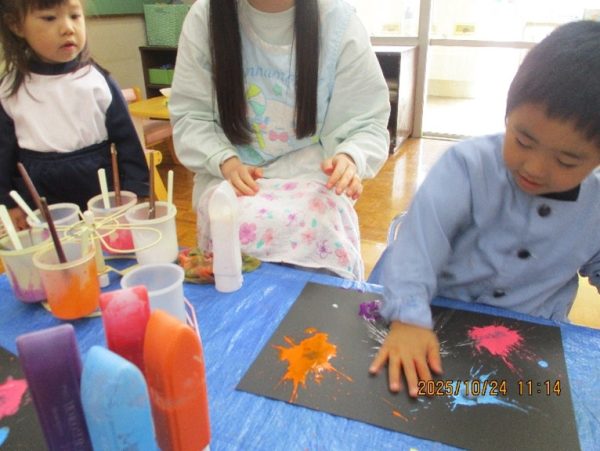 手にペタペタ絵具を付けて、ダイナミックにスタンプ!!