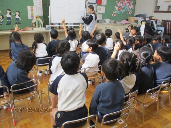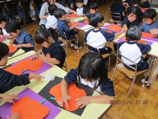 切って、貼って・・・年少組は先生の説明をしっかり聞いて ひとつ一つの作業を丁寧にこなしていました。