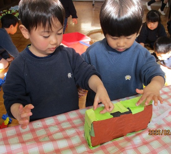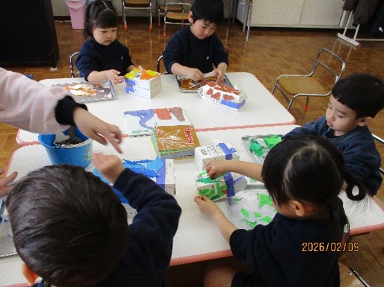 年少組・たんぽぽ組も手にたくさん糊をつけて