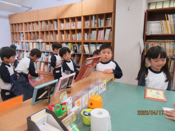 図書室の使い方や絵本の借り方、借りた絵本の扱い方について、学年ごとに確認しました。