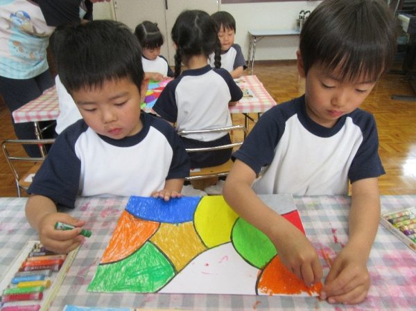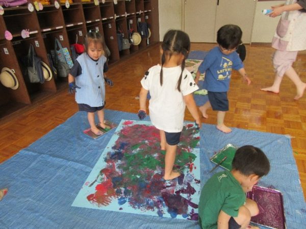年少組は、汚れてもよいTシャツに着替えて絵具遊びを行いました。