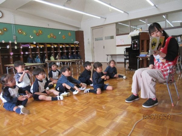 年少組は、先生に絵本を読んでもらっていましたが、みんな絵本の世界に引き込まれるように身を乗り出していましたよ。